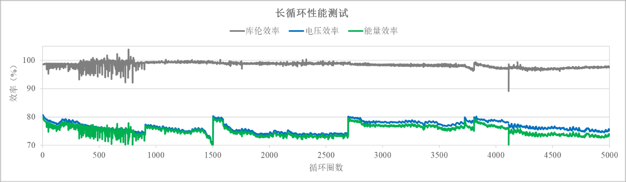 低自放电:极低的钒离子渗透率可让钒电池的库伦效率提升至99%以上,运行中的自放电率大大降低,尤其适用于长时间不间断运行的调频场景。 -
