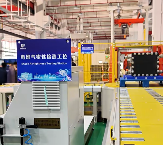 产线集成了自动堆叠、压装紧固、翻转检测及气密检测等关键工序,通过自动化生产大幅提升了电堆的装配效率和产品一致性,为规模化应用奠定了坚实基础。